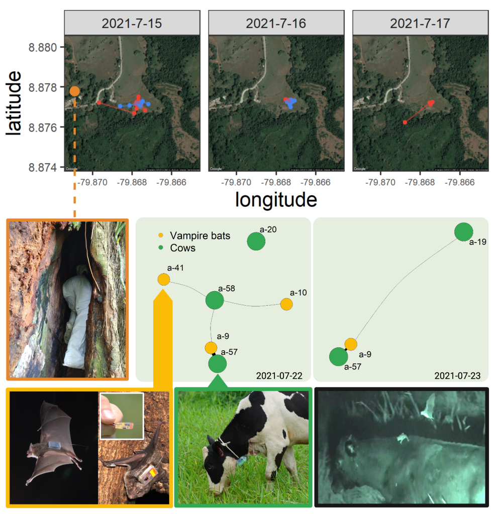 The ability to predict cross-species transmission is often restricted by a knowledge gap. How does contact between reservoir and host species facilitate pathogen transmission across species borders? Answers to this question are often limited because it is difficult to measure contacts of animals in the wild. We combine (1) biologging approaches such as highly efficient and miniaturized proximity sensors to simultaneously track encounters among many individuals with (2) molecular methods to quantify genetic similarity of pathogens in samples. By combining these methods, we aim to improve inferences about transmission between species. Currently, we work on contact networks of neotropical vampire bats, their host species (livestock such as cattle), and co-roosting bat species. In the future, we aim to extend this method to investigate fine-scale behavioral interactions in other systems that involve contact between animals or their use of shared spatial locations.